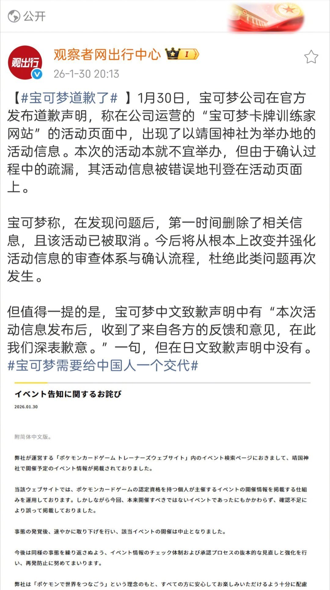 宝可梦道歉了,这是中国互联网舆论力量的胜利,也是正义的胜利。中国公众发出的信息很清楚:日本的大公司都须离靖国神社远一点。老胡在此还要加一句:离日本极右翼也远一点!他们需要了解中国人最讨厌的日本军国主义和现代极右翼符号的清单,并且远离TAZ们。一旦出了问题,他们唯一应当最做的就是诚恳道歉并改正。